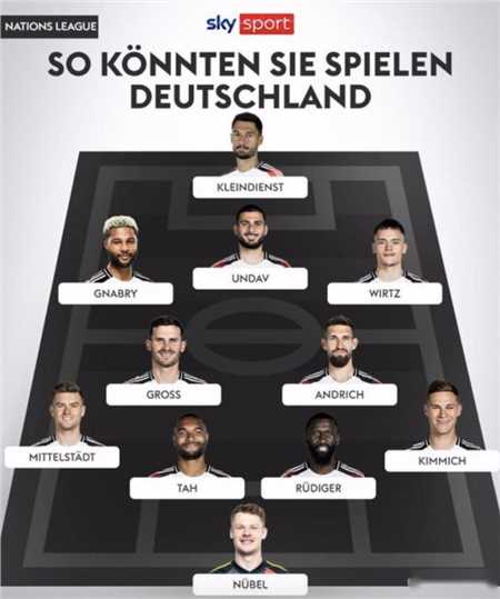 北京时间10月12日凌晨2:45,德国队将迎来欧国联a级联赛第三轮客场对阵波黑的比赛。赛前,德天空预测了德国队的首发阵容。