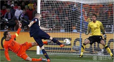 (北京时间)2010年7月12日,南非世界杯决赛,对阵双方是西班牙队vs荷兰队。90分钟过后,两队比分0-0,进入加时赛。比赛第116分钟,伊涅斯塔挺身而出,抽射破门一剑封喉,帮助西班牙队完成绝杀,并且捧起世界杯冠军奖杯。