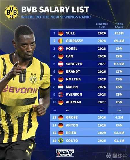 多特蒙德在今夏花费2850万欧元从霍芬海姆引进了拜尔,2250万欧元从斯图加特签下了安东,1800万欧元从斯图加特签下了塞罗-吉拉西,700万欧元从布莱顿签下了格罗斯,400万欧元从曼城租借了扬-科托。