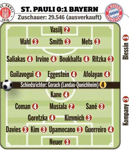 在昨天晚上进行的德甲第10轮比赛中,拜仁客场1-0击败圣保利,赛后,《图片报》对两队的球员进行了评分。