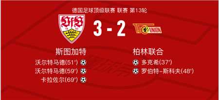 北京时间12月7日斯图加特vs柏林联合,卡拉佐尔得到全场最高的8.5分,法比安-里德得到全场最低的5.6分