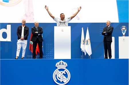 【亮相仪式在伯纳乌举行,姆巴佩多次亲吻皇马队徽】