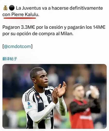 尤文图斯确认他们会签约卡卢卢!实际上卡卢卢已经是尤文图斯的一员了。尤文图斯已经支付了330万的租借费,并将向米兰支付1400万选择购买权费用。尤文图斯对卡卢卢十分满意,他在尤文图斯的表现获得了尤文图斯全队的认可。
