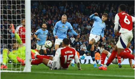 一场焦点对决中,瓜迪奥拉执教的卫冕冠军曼城由挪威中锋哈兰德打破场上僵局,之后阿森纳连追两球完成反超,凭借斯通斯在全场补时第8分钟的读秒绝平进球,主场2比2与十人应战的枪手阿森纳握手言和。蓝月亮曼城结束开局4连胜,以4胜1平积13分的不败战绩继续占据领头羊位置,但领先优势缩小为1分。