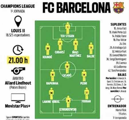 新赛季欧冠联赛阶段首轮,巴萨将客场对阵摩纳哥,赛前,《每日体育报》预测巴萨此役首发,三中场为拉菲尼亚、佩德里、卡萨多。